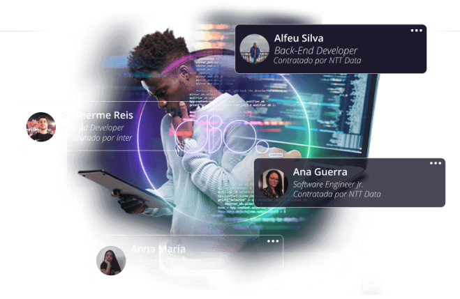 Junte-se ao nosso ecossistema e transforme o mundo com a gente! Todos os dias dezenas de empresas acessam a nossa plataforma em busca dos talentos mais criativos, dinâmicos e colaborativos, além do conhecimento técnico. A nossa missão é te preparar para que você conecte-se com as melhores oportunidades.